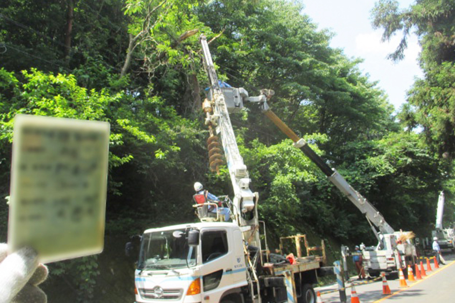 (写真は配電線路へ倒木した樹木の伐採工事)